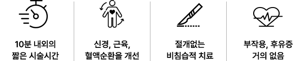 신생 혈관의 생성과 조직 생성을 유도하는 재생 치료 방법으로 널리 사용되고 있는 체외충격파치료는 통증이 발생한 부위에 충격파를 가하여 해당 부위 주변의 혈관 재생성을 돕고, 조직을 활성화 시켜 통증을 완화 시켜주며 신체 기능을 개선하는데 큰 도움을 주는 치료법입니다.